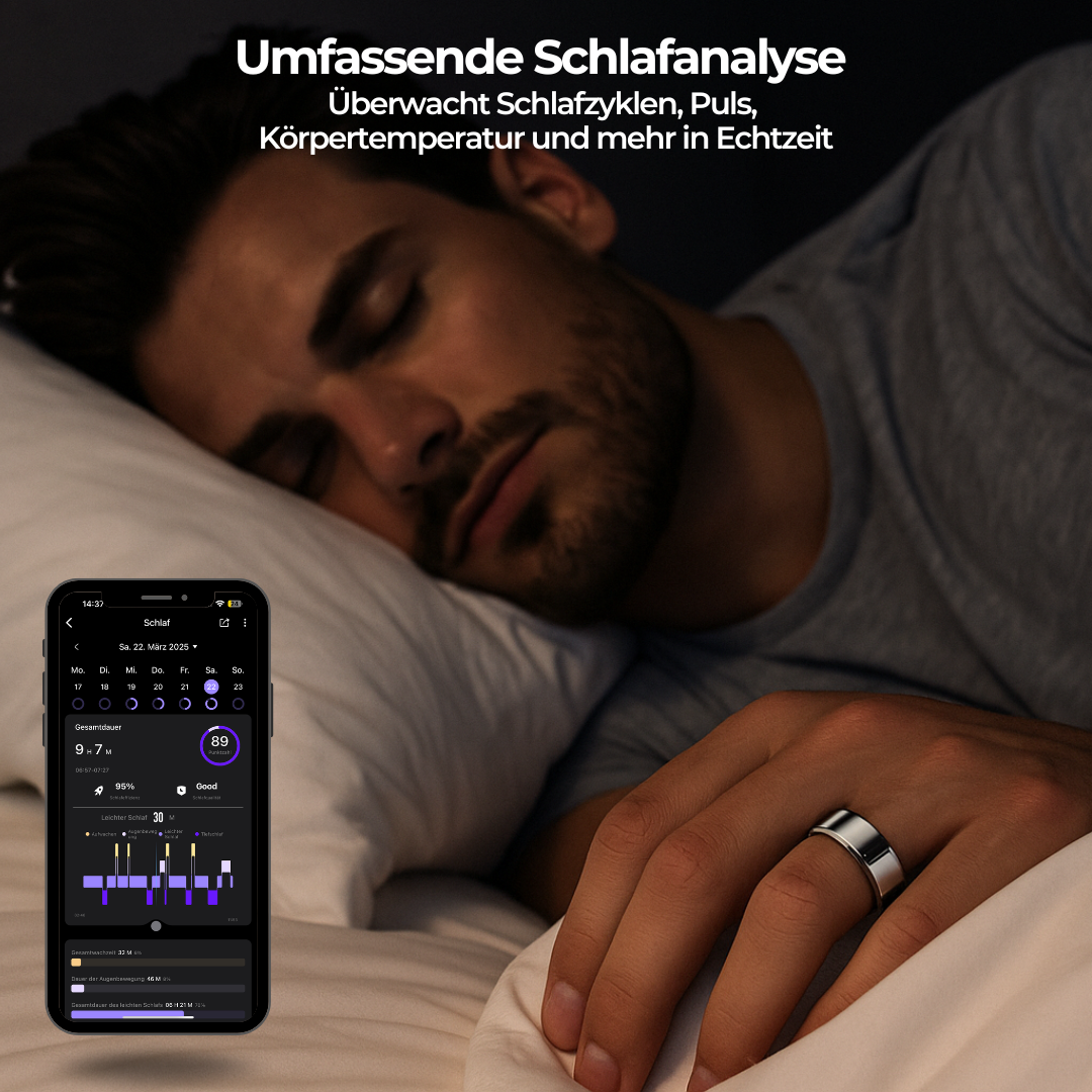 Der Smart Ring analysiert Ihre Schlafphasen, Herzfrequenz und mehr – für erholsamere Nächte und energiereiche Tage.